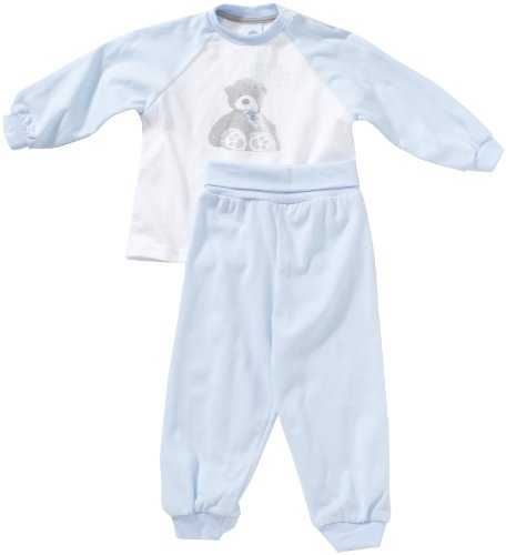 Süßer Jungen-Schlafanzug lang in der Farbe hellblau mit niedlichem "Bärchen"-Motivdruck und 2-farbigem Oberteil. Die nickelfreien Druckknöpfe im Schulterbereich erleichtern das An- und Ausziehen. Die bequemen Bündchen am Bein sorgen für optimalen Halt und angenehmen Tragekomfort. Das Material besteht aus 100% Baumwolle.