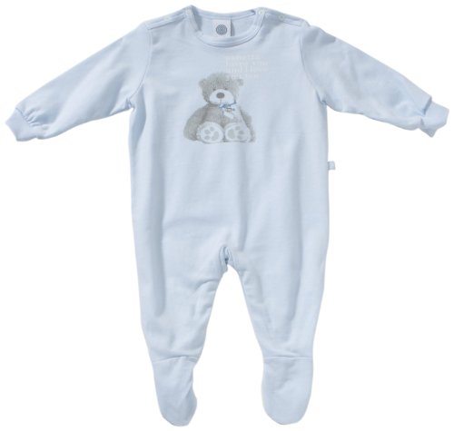 Süßer Jungen-Overall in der Farbe hellblau mit niedlichem "Bärchen"-Motivdruck (Ab Gr. 92 ohne Fuß). Die nickelfreien Druckknöpfe im Schulterbereich und im Schritt erleichtern das An- und Ausziehen. Das Material besteht aus 100% Baumwolle.