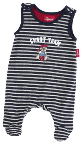 niedlicher marineblau, grau und weiß gestreifert Strampler, süßer gestickter Seehund und Schriftzug vorne, Hals- und Armausschnitt in marineblau, an den Trägern und im Schritt mit Druckknöpfen, mit Füßen, ganz weiches Material