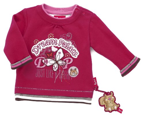 knuffiges Sweatshirt in cerise pink, süßer Druck und Schmetterlings-Stickerei vorne, Rundhalsausschnitt mit rose abgesetzt, schmale Armbündchen und Bauchbündchen gestreift, an einer Schulter mit Druckknöpfen